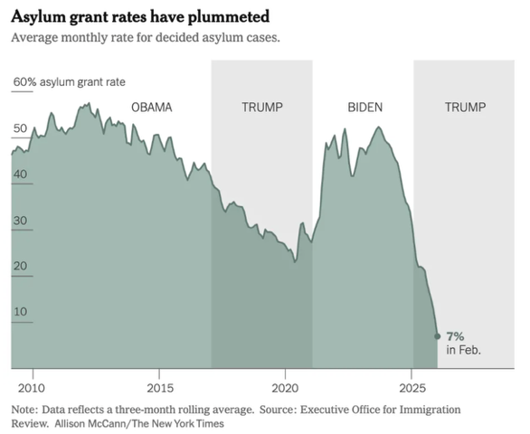 (Iris Stone) – A new chart based on data from the Executive Office for Immigration Review, reported by The New York Times, shows asylum approval rates have fallen fast.